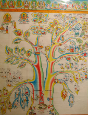 在上述80幅唐卡中:屬于藏醫(yī)學(xué)基礎(chǔ)理論方面,樹喻學(xué)說見于唐卡(2)—(4)。唐卡(18)按照人體“龍”、“赤巴”、“培根”的“三大因素”學(xué),提出了它們是維持生命的物質(zhì)基礎(chǔ),人體平衡失調(diào)均可致病。