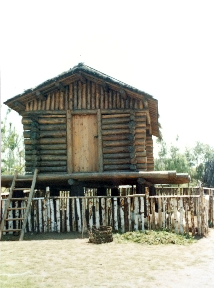早期,每一個家族公社都有一個公用的高腳倉庫,鄂倫春語叫“歐倫”,一般是在游獵的中心地帶,選擇四棵自然生長、成對角的樹,在距地面約3—4米高的地方留一個樹杈,砍掉其余的樹頭,樹杈上架兩根直樹干,樹干上面一根挨一根地平鋪木桿成為底座,底座上用木桿壘一個“木刻楞”小房或用樹枝做一個半圓形的架子,覆蓋樺樹皮,然后用藤條或樹皮綁縛固定。一側(cè)留有進出的小門,借助木梯上下,為防止野獸攀上糟蹋東西,平時都把木梯放倒在一邊。這種倉庫主要存放一些暫時吃不了和用不著的食品和雜物,搬遷時不拆除,里面的東西也不帶走,什么時候需要再騎馬來取。個體小家庭獨立以后,公共庫房變成了私家財產(chǎn)。雖說是私家財產(chǎn),卻從不留人看守,也不上鎖。獵人在外打獵,如果一時斷糧,可以不經(jīng)主人允許,隨便到任何一家的“歐倫”中拿走所需要的東西,事后向主人通告一聲即可,以后有了如數(shù)奉還,不還主人也不索要。