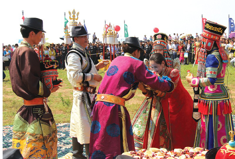 蒙古族婚禮儀程復(fù)雜,內(nèi)容豐富多彩,因地域、部族和傳統(tǒng)習(xí)俗的不同,各部落、各地區(qū)的婚禮形式和程序等方面也有較大差別。如錫林郭勒盟烏珠穆沁的婚俗儀式由定親、下聘禮、訂婚期、請(qǐng)客人、縫制氈包、婚禮前的準(zhǔn)備、互贈(zèng)禮品、雙方各自舉行婚宴、娶親、送親、迎親、男方家的婚宴和儀式、宴請(qǐng)幫忙的人、入洞房、回看姑娘等儀式程序。