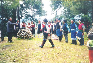 節(jié)日一大早,各家各戶便到供奉藥仙的樹林中,環(huán)藥仙的化身——一堆奇石或一棵古樹歌舞、供祭。隨后,人們各自相約成組,背籃荷鋤,唱著《采藥歌》,游山采藥。若遇到要采、挖的植物,小組中年歲最長的人,會在其根部先挖一鋤,然后停鋤唱起《盤歌》:這是一兜草,它叫什么草?用它治啥???藥功好不好?隨之,挖藥者便從小到大,一人回唱一句作答:草名金錢草,采來加工變成寶,味苦、性涼用處多,肝病、尿阻少不了……之后,方采挖這棵藥草。