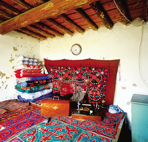 新疆維吾爾自治區(qū)木壘縣大南溝烏孜別克民族鄉(xiāng)鄉(xiāng)政府為烏孜別克牧民集中興建了定居房。新村街道整齊,土墻圍成的院落獨(dú)門獨(dú)院。院落很大,前院種菜栽樹,有水井,房后是牛欄羊圈。有的還單建了廂房作廚房。這里的住房都是長(zhǎng)方形土坯平頂房,玻璃窗,墻壁很厚,冬暖夏涼。屋內(nèi)橫梁和走廊的木柱、木梁上有的是工筆重彩的花紋圖案,有的用雕花石膏鑲嵌或磚、木雕刻后鑲嵌,做工精細(xì)。墻壁上有整齊排列的拱形壁龕,里面擺著日用品和工藝品,四周也鑲嵌著花紋圖案。居民們住板炕,在屋里地上挖一小坑,坑內(nèi)放置火爐,鐵皮煙囪通向室外,坑上橫搭木板成板炕,板炕上鋪花氈坐毯。靠墻一邊擺著疊得整齊的被褥,繡花枕頭對(duì)稱地立在被褥上。墻上掛著壁毯,整個(gè)室內(nèi)既有局部美,又有整體美,賞心悅目。