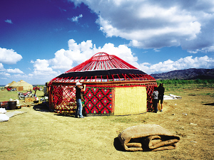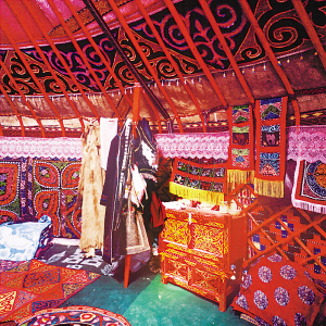 氈房外觀通常樸實無華,門框由松木做成,上面雕刻花紋或繪制圖案,一塊鮮艷奪目的掛毯吊在門上。房內(nèi)富麗堂皇,布置合理,前半部分堆放日用物品,后半部分待客、住人。