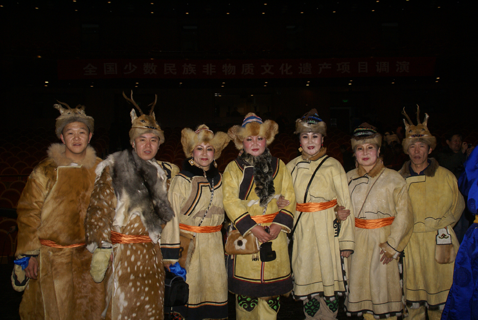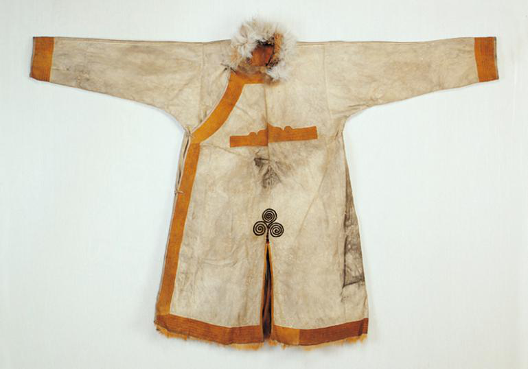 鄂倫春族的傳統(tǒng)服裝以袍式為主,冬季穿“蘇恩”。“蘇恩”是用冬季絨毛狍皮縫制的右任長(zhǎng)袍,小立領(lǐng),襟邊、下擺和袖口用黑色皮鑲嵌云卷花紋等邊飾,女袍還要作環(huán)肩裝飾。為便于奔跑和騎馬,“蘇恩”都有開衩,衩口裝飾圖案豐富多彩。夏天穿用夏季沙毛狍皮制作的短袍或坎肩,布匹傳入以后穿布袍。 男子下身穿狍皮短褲,褲腿過膝,樣式如老式免襠褲,后來改穿長(zhǎng)褲。出獵時(shí)褲子上面還要穿套褲。套褲無襠,呈筒狀,上角釘有皮條,系在腰帶上。一般用夏季的狍皮縫制,因?yàn)橄募镜尼笃ぐ搴衲湍?,也有用鹿皮縫制的。婦女的褲子樣式比較獨(dú)特,長(zhǎng)至腳面,比男褲瘦些,腰兩側(cè)有開衩,前面有兜肚,兜肚頂端釘皮條,系在脖子上。這樣的褲子,既保暖又便于騎馬,可以護(hù)住前心,又起到了乳罩的作用。講究的人還在褲子兩側(cè)和褲腳處繡上花邊圖案。