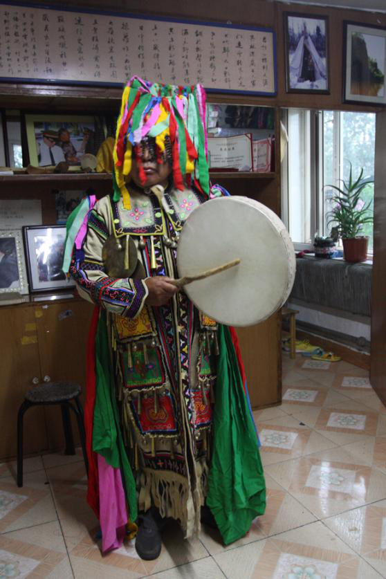 冬天穿的鞋是“奇哈密”和“溫得”,“奇哈密”是用狍脖皮或犴皮做靴底,用狍腿皮拼縫成靿的短靴。“溫得”是用鹿或犴皮做底,鹿或犴腿皮拼縫成靿的長(zhǎng)靴?!皽氐谩币?yàn)殪壐撸齑┲颢C不易灌雪。這兩種靴子都要用冬季絨毛狍皮做成的襪子配套穿用,暖和跟腳,踩在雪地上沒有聲響。夏天一般穿“奧勞其”,是一種皮底布靿短靴?!翱己袈洹保怯枚窘q毛狍皮縫制的二指手套,掌面腕部留一縫口,手從縫口中伸出,手套仍護(hù)在手背上,既使在零下40度的嚴(yán)寒中處理獵物,也不用擔(dān)心手被凍壞。還有一種五指狍皮手套,背面正中繡花、蝶等中心圖案,五指的關(guān)節(jié)和指甲處繡出各種小型圖案,然后用連理枝將中心圖案和關(guān)節(jié)、指甲圖案連為一體,中心圖案代表手掌,手指圖案代表關(guān)節(jié)和指甲,連理枝代表骨骼和血脈(圖為越來越鮮見的薩滿服飾,吳雅芝供圖)。