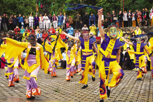 圖①為祭師們手捧獻給祖先的瓜果、茶、酒,等待儀式開始。圖②為在樂祭中,祭師們跳起歡快的娛神舞。