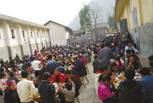 每年秋收后到翌年播種前,是四川涼山金陽縣人結婚的黃金季節(jié)。無論是在縣城還是農(nóng)村,不管是吃“九斗碗”,還是吃“坨坨肉”,大家都喜歡擺壩壩宴。在金陽縣城,常常可以看到這樣一幅景象:數(shù)百人聚在一處,圍坐于一張張方桌旁,伸箸暢食,舉杯暢飲。一盆盆肉端上桌子,主人不停地招呼客人趁熱吃。