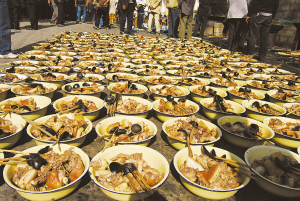 壩壩宴最能體現(xiàn)出金陽人的飲食文化。但要吃出味道,吃出氛圍,則大有講究。在形式上,吃飯聲勢要大,食客多多益善。在內(nèi)容上,肉要多,平均每個人至少有5塊坨坨肉。如果不夠吃,辦酒的主人家就會覺得丟臉,別人也會有所議論。一般來講,一桌上一盆肉,8斤左右為宜。