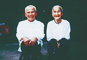 當(dāng)我來到時(shí),老人已經(jīng)入殮。我借機(jī)打量傣家這從不許外人參觀的、全家?guī)状硕妓诶镞叺纳衩氐呐P室。只見臥室是一個(gè)通廊,里邊一長(zhǎng)溜的帕墊(傣家人用來睡覺的棉被)都收裹起來,棺材就橫放在臥室的中央,一個(gè)用竹子編成喇叭形狀的燈架里有一盞燃著的油燈;棺材的上面橫拉著一根筷子粗的尼龍繩,上面掛著一些筒裙衣物,想來可能是死者的;幾個(gè)男性老人圍著棺木而坐,往棺木上剪貼著白、綠、紫、黃幾種顏色的紙花。隨后而來的巖化告訴我說:“過世的老人已有82歲了。她生前為人隨和,很受寨子里晚輩的敬重。死前已臥床一個(gè)多星期,不吃不喝,也無疼痛跡象,正所謂天年已盡,壽終正寢?!睅r化還向我介紹說:按傣族的習(xí)慣,死者一咽氣,親友便立即用溫水為死者洗澡、梳頭、洗臉(洗臉時(shí),由下向上,以示區(qū)別于活人),穿上新的衣、褲、襪、鞋,包新頭帕。還要在死者嘴里放入一小砣金或銀,稱作含口錢。然后用白布裹尸,將死者雙掌合十,放進(jìn)棺材里,用一塊方帕蓋臉。最后蓋上棺材,并通知寨子里的人。