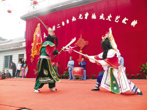 對(duì)漢民族所崇拜的英雄豪杰、尚武精神,大寨村的布依族祖先沒有排斥,在保持自己民族習(xí)慣的同時(shí)大膽接受。也許,在他們心中,具有儺戲性質(zhì)的地戲可以驅(qū)除不良習(xí)氣。