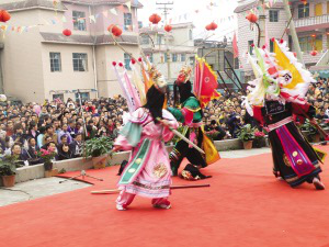 在貴陽花溪,地戲可不止大寨一撥?;ㄏ獏^(qū)的地戲共有18撥,也就是各個(gè)村寨的地戲隊(duì):花溪大寨、燕樓的思惹、槐州、燕樓村(燕樓村有兩撥)、谷蒙、黨武的當(dāng)陽、葵林村、新寨、下壩、湖潮的新民、楊梅、寅貢、車田、蘆官、汪官、元方和麥坪的杉木二村。這些地戲隊(duì)所演出的劇目都是《薛仁貴征東》、《楊家將》、《羅通掃白》、《三國(guó)演義》、《岳飛傳》等歷史故事劇,表演場(chǎng)地方便人們觀看。演者均戴面具,服飾簡(jiǎn)單,以鼓擊節(jié)而歌,一人領(lǐng)唱,眾人合之,不用其它樂器伴奏,其風(fēng)貌近似陽腔。