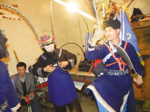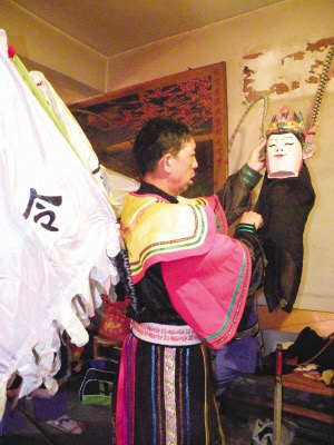 請(qǐng)“臉子”是地戲表演時(shí)一個(gè)非常講究的開場(chǎng)儀式?!巴捅さ貞颉钡恼?qǐng)臉子儀式通常是整個(gè)戲班子的人都必須參加祭拜。表演時(shí)必須鄭重地從箱子里請(qǐng)出珍藏的“臉子”,“臉子”才具有神的靈性??墒俏覀兛吹降拇笳家赖貞?,在保持傳統(tǒng)的同時(shí)又不失自己的個(gè)性。通常請(qǐng)“臉子”是由當(dāng)?shù)亻L(zhǎng)老一個(gè)人完成所有的祭拜過程,一切都是那么簡(jiǎn)單。祭拜中都是用當(dāng)?shù)氐牟家涝掓告傅纴?,這樣的表演給它增添了別有的韻味。
