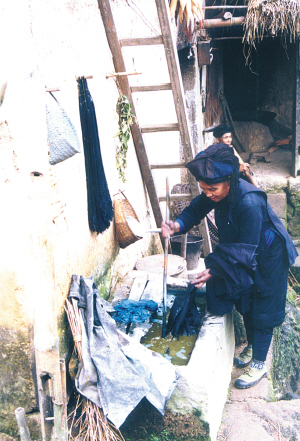 紡紗、織布、藍(lán)染,是哈尼族婦女制作服裝的重要組成部分。她們在織布前要做的準(zhǔn)備工作,就是操動(dòng)制線機(jī),把一根根短小的線連接起來,捲在小木棍上,然后操動(dòng)絞線機(jī),把線棍上的線分開絞在木梭子和木輪子上。接著是分線,人數(shù)不限,但不能少于5人,一般10米為一組線。織布時(shí),在織布機(jī)上方搭起兩排密集的線網(wǎng),當(dāng)雙腳踩動(dòng)踏板時(shí),兩排線網(wǎng)一上一下地交叉移動(dòng),將拖著線的梭子一次次地左右穿梭于線網(wǎng)中。這樣重復(fù)地進(jìn)行,就織出一筒筒布,一般10米為一筒布。最后把織成的布放入靛缸里泡洗,曬干后就可以制作服裝了。