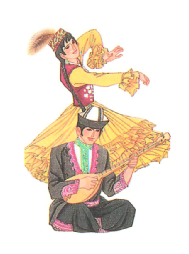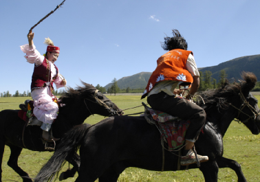 哈薩克族的傳統(tǒng)樂器可分為彈奏樂器、吹奏樂器以及打奏樂器。其中“冬不拉”、“薩孜”和“布特根”屬?gòu)椬鄻菲?;“斯伯孜俄”、“斯?fàn)柲且馈钡葘俅底鄻菲?;“達(dá)布拉”、“哈拉”等屬打奏樂器。無論是哪種類型的樂器無疑都將哈薩克族人民豪放灑脫,但又不失柔軟細(xì)膩的情感表現(xiàn)得淋漓盡致。哈薩克族的舞蹈剛健有力,瀟灑優(yōu)美,如“喀達(dá)卓日哈(黑走馬)”、“狗熊舞”、“鷹舞”、“擠奶舞”等都是反映哈薩克族人民日常生活的民族舞蹈。除歌曲、舞蹈以外,哈薩克族還有姑娘追、叼羊、賽馬等妙趣橫生的體育娛樂活動(dòng)。