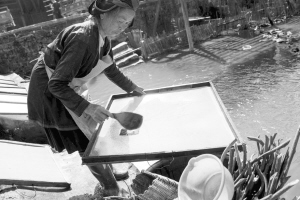 占里村共有182戶827人,這里的侗族古法造紙術(shù)源遠(yuǎn)流長(zhǎng),全村從事造紙業(yè)的就有170戶,占總戶數(shù)的93%。這里的造紙業(yè)依然保留著原始的家庭作坊和世代傳承的手工制作方式。這種古法造紙技藝以構(gòu)樹皮為原材料,添加獼猴桃藤、野棉花根,經(jīng)過(guò)水浸泡、石灰腌制、蒸煮、碓爛、攤曬、燒堿漂白、打漿、瀝水、抄紙、烤干等72道工序,最終制成白皮紙。