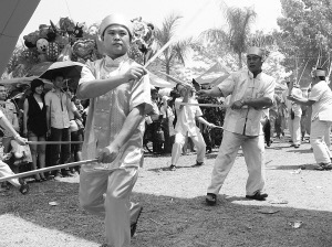 據(jù)介紹,傣族武術(shù)是傣族人民在長期生產(chǎn)生活實踐中產(chǎn)生的。傣族人民從飛禽走獸的神態(tài)中吸取動作要領(lǐng),演化出武術(shù)招式,這些武術(shù)招式既有舞蹈娛樂的性質(zhì),又有健身防衛(wèi)之功能。根據(jù)形態(tài)和招式,傣族武術(shù)有“鳳凰拳”的美稱。作為傣族民間運動的瑰寶,武術(shù)曾是每一個傣族男人的必修課。但目前,傣族武術(shù)這一傳統(tǒng)文化瑰寶的傳承和弘揚面臨很多困難。