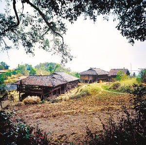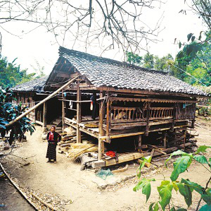 云南省潞西市三臺山鄉(xiāng)的德昂族居住分散,村寨很小,大都建在高半山上,山路行車困難。傳統(tǒng)住房為正方形干欄式竹木建筑,房屋兩層,為木柱結(jié)構(gòu)框架,竹篾編片圍墻,粗竹劈壓成自然的竹片做樓板,屋頂苫草排,當?shù)厮追Q“草帽頂房?!?/p>