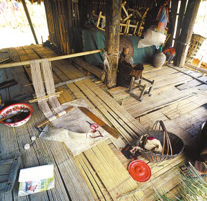樓上住人、煮飯、貯藏糧食,樓下圈養(yǎng)牲畜。以簡易板梯上下,有小廊道。室內(nèi)順梁開前后兩道門,中間的通道將屋內(nèi)分成兩部分。右側(cè)為客房,設(shè)火塘,供佛像;左側(cè)為家人臥房,以竹篾隨意分隔,無門,只擋一布簾,通風透光。正門一邊搭曬臺,用來曬糧、曬衣服和洗漱。住房一側(cè)多建有附房,用以堆柴、舂米、放置生產(chǎn)工具和雜物。