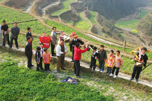 不一會兒,浩浩蕩蕩的娶親隊伍沿著田埂走過來了??匆娐愤厰[放的東西,他們就在衣服上面留下了糯米飯、雞肉之類的食物。