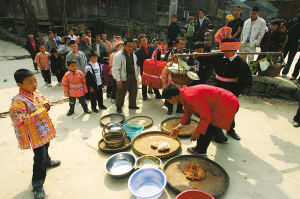 如有路人在途中遇見新娘一行,可將隨身的衣服鋪在路面,并將隨身帶的貴重物品放在衣服上,這樣就會得到娶親隊伍的“獎賞”。