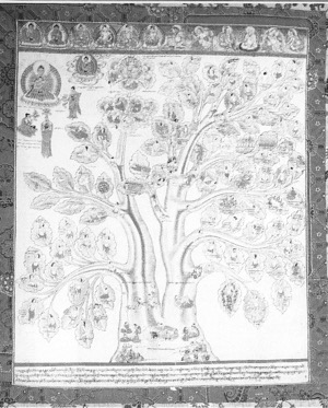 藏族“湯卡”的繪制有一個(gè)特點(diǎn),就是不注明繪制日期或繪制人的姓名(除個(gè)別的“曼湯”外),但藏族“曼湯”卻另有特點(diǎn),就是在“曼湯”的最上方留有一定位置來(lái)繪制醫(yī)學(xué)中的重要人物,特別是古代醫(yī)學(xué)家。藏族古代醫(yī)學(xué)家往往也是宗教人物。
