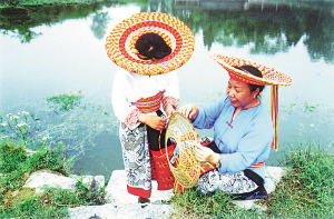 亮麗的頭巾,是用一兩百米長(zhǎng)的彩色花帶,一圈圈地往頭上悉心地盤(pán)纏,狀若葵花。頭巾隨著姑娘們俊美的身影晃動(dòng)在山野,宛若束束火樣的山花。盤(pán)頭巾的彩色花帶是靠姑娘們靈巧的雙手用紅黃兩色毛線(xiàn)編織而成。哪曾知道,盤(pán)個(gè)講究點(diǎn)的頭巾,除了從小就要不斷研習(xí),每天還得花上半個(gè)小時(shí)。耐看,但太過(guò)麻煩。近年來(lái),瑤山的生活節(jié)奏也在加快,聰明的奉雪妹就別出心裁,幾經(jīng)實(shí)驗(yàn)改進(jìn),用竹篾條編成一個(gè)斗笠般的錐臺(tái)形骨架,再把花帶依次編滿(mǎn)骨架的上下兩面,就成了形似斗笠的花頭巾。出門(mén)往頭上一戴,與原有風(fēng)格相近,卻更顯風(fēng)韻,也更方便。這也是花瑤妹子對(duì)代代相承的傳統(tǒng)服飾文化的一次大膽改革。