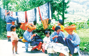 季節(jié)在閑著,整個(gè)寨子卻在忙。漢子們隨意兜幾個(gè)煨熟的紅薯,就出門(mén)挖山土、砍柴火去了。女人們則湊到一起說(shuō)著、笑著或哼著,專(zhuān)心做起她們心愛(ài)的挑花活計(jì)來(lái)。吊腳樓、屋檐下、火塘邊、堂屋里、巖石上、小溪旁,到處都散落著三三兩兩挑繡花裙的姑娘。提起挑花,姑娘們可就來(lái)神了,個(gè)個(gè)都有一手好絕活,誰(shuí)都可以說(shuō)出好幾個(gè)道道來(lái)。她們從六七歲時(shí)起,就要在娘手把手的嚴(yán)格規(guī)訓(xùn)下,穿針引線(xiàn),學(xué)著挑花。年復(fù)一年,傾其心智,從不間斷,直到終老。