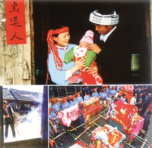 在花瑤同胞心中,沒(méi)有什么比人丁興旺、族群繁衍更加重要的了,所以他們常常把生孩子看得比結(jié)婚還要重,并要在孩子出生的第三天舉行熱烈盛大的誕生禮,稱(chēng)之為“打三斗”。打三斗的禮儀,新奇、熱烈、繁縟而有趣,歷時(shí)兩天一晚。是對(duì)嬰孩、對(duì)主家的道賀,也是對(duì)寨子新添人丁的祝福。