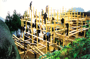 花瑤同胞修建新屋,至今沿襲著奇特古老的巫風(fēng)。對(duì)于宅基地的選擇要請(qǐng)地仙擇地,幫助選向和挑選動(dòng)工日期。待三柱或五柱一扇的木架子做好后,豎架上梁的那天,全寨的親鄰都會(huì)主動(dòng)來(lái)幫忙。用繩子拉的、用叉子撐的、用肩膀頂?shù)?、用木槌敲的、用雙手推的,各居各位后,一聲喊起,—扇木架瞬間立于宅基上了。