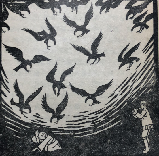 誰(shuí)知笛聲一響,成群的兀鷹像是聽了誰(shuí)的召喚,黑壓壓的一大片,直往奴隸主頭上飛來(lái)。奴隸主知道,只要鷹落下來(lái),自己就沒命了,便急忙向娃發(fā)求饒道:“快把鷹叫開,你要啥我給啥!”娃發(fā)隨口說(shuō)道:“給達(dá)卜達(dá)爾的塔吉克人每家十只羊,十頭牛,十峰駱駝,行嗎?”奴隸主連忙點(diǎn)頭:“行!行!要什么都給。”這時(shí),娃發(fā)又吹起了“鷹笛”,鷹群才飛走了。