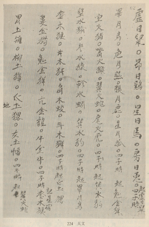 水書天文書抄本。寫于民國年間。書于白皮紙上,從右至左直寫,高36厘米,寬26厘米,共39頁。圖中為星象名稱。皆借漢字諧音,由此可窺察水族文字的發(fā)展狀況。原件存北京圖書館。