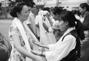 藏族學(xué)生向來自浙江的支教老師表達祝福。 王麗煒攝