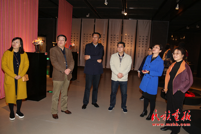中國民族博物館館長顧群(左三)、中國婦女兒童博物館副館長劉華彬(右三)、中國民族博物館副館長張志文(左二)、中國民族博物館副館長鄭茜(右一)等嘉賓參觀展覽