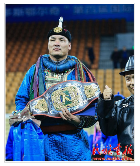 “鄂爾多斯鄂爾奇”第四屆國際蒙古搏克金腰帶爭(zhēng)霸賽冠軍得主查干扎那