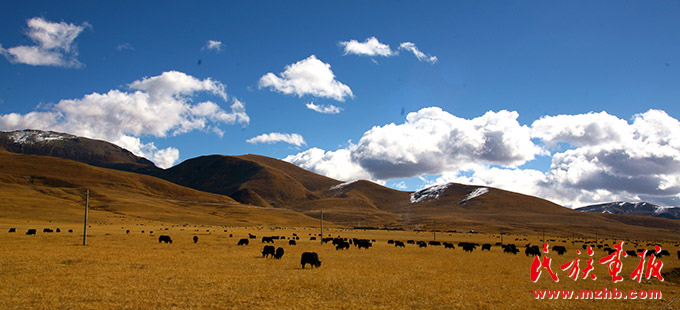 甘孜州的藍天白云、安詳牧群,金黃色西洋油畫般的美景吸引著八方游人(民族畫報社 列來拉杜攝影)