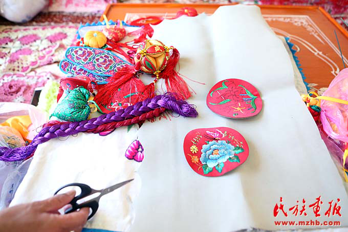 走進她的家中,只見不大的房間中擺滿了荷包、繡花鞋墊、枕頭等刺繡品。桌上五顏六色的彩線旁,馬阿英社和兒媳婦正聚精會神地依著設計好的圖案“飛針走線”。