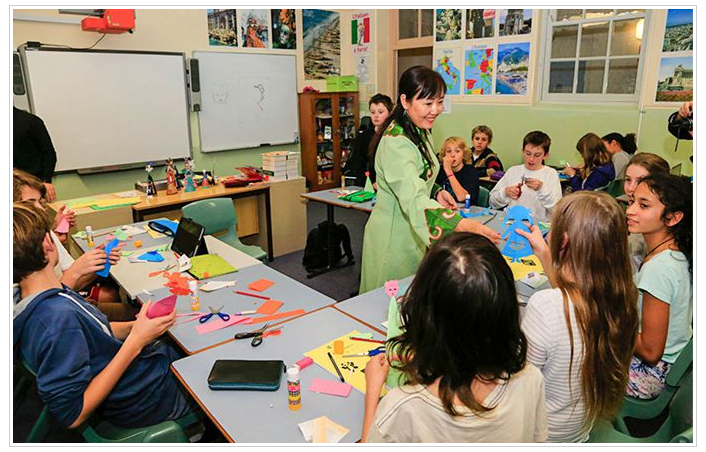 2014年7月,蘇梅把精美絕倫的“哈尼卡”剪紙藝術(shù)帶給了澳大利亞悉尼莫斯曼中學(xué)的學(xué)生們 (賀吉 攝影)