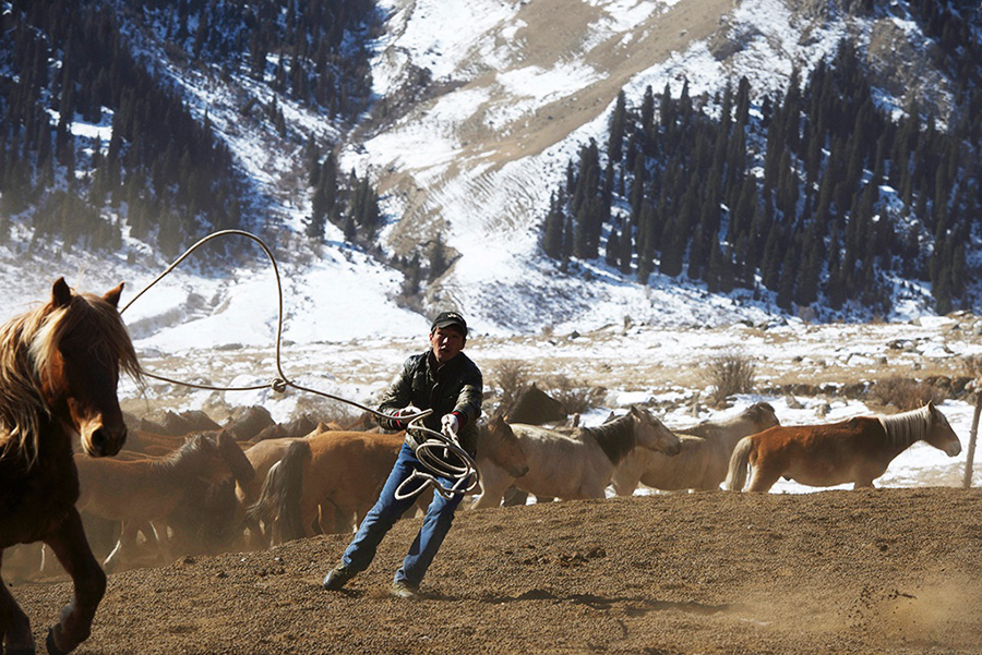 我首先到訪的是達(dá)楞達(dá)坂一帶。接待我的主人卡瑪儀表堂堂,60多歲還在照料自家的畜群。老人沒有興趣放羊,每天吆著100多匹馬和300頭牦牛在日月間往復(fù)。一望無際的雪原,把暴烈的馬群和野性難馴的牦牛吆往一個(gè)地方或再吆回去,騎馬的強(qiáng)度與奔跑的頻率遠(yuǎn)不是他這個(gè)年紀(jì)的人所能駕馭的了。但老人不這么想,他不愿意在和靜縣城的暖氣房子里喝茶陪孫子們,而更愿意在他的馬背上,每天奔波在雪原上。