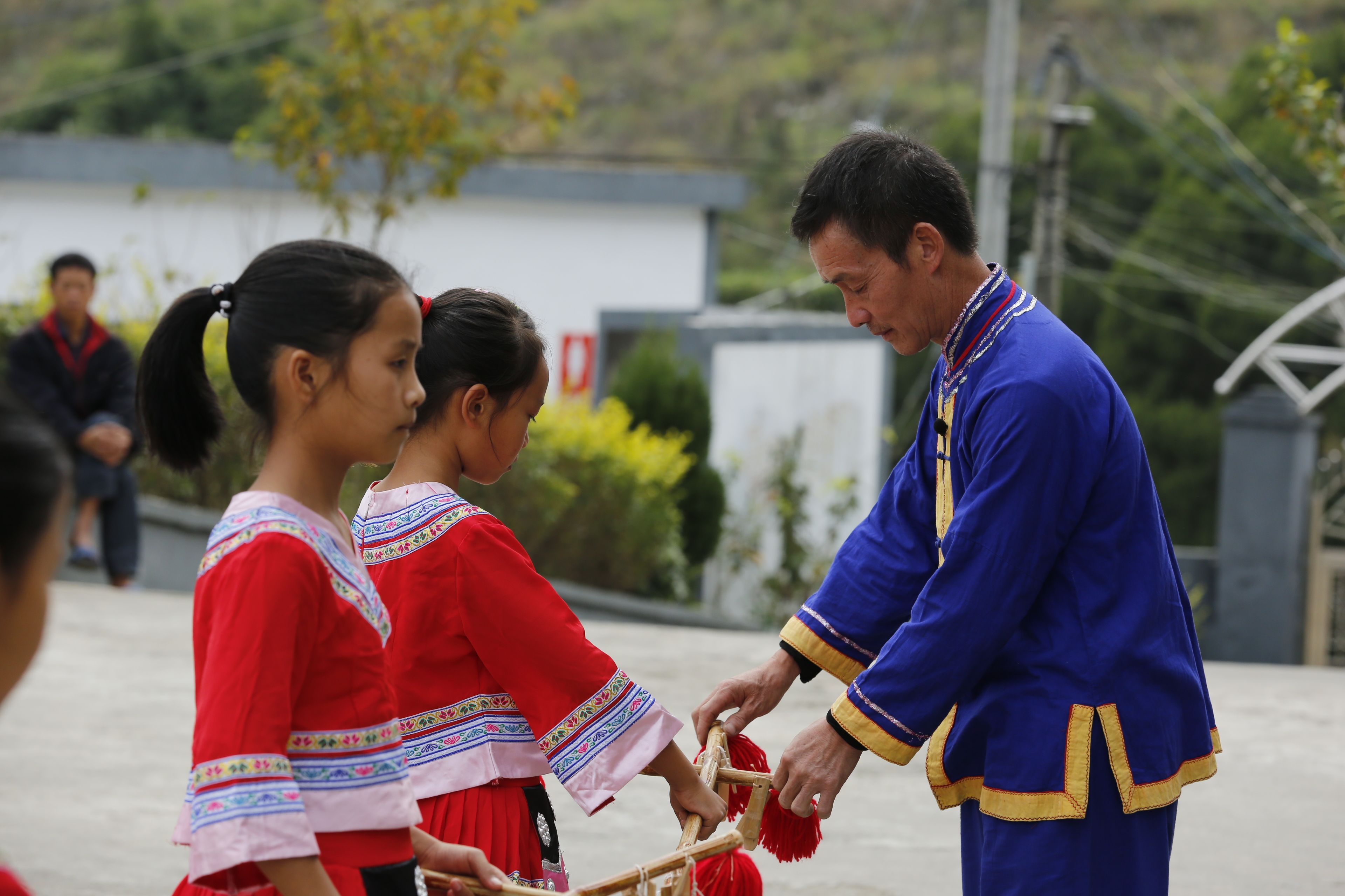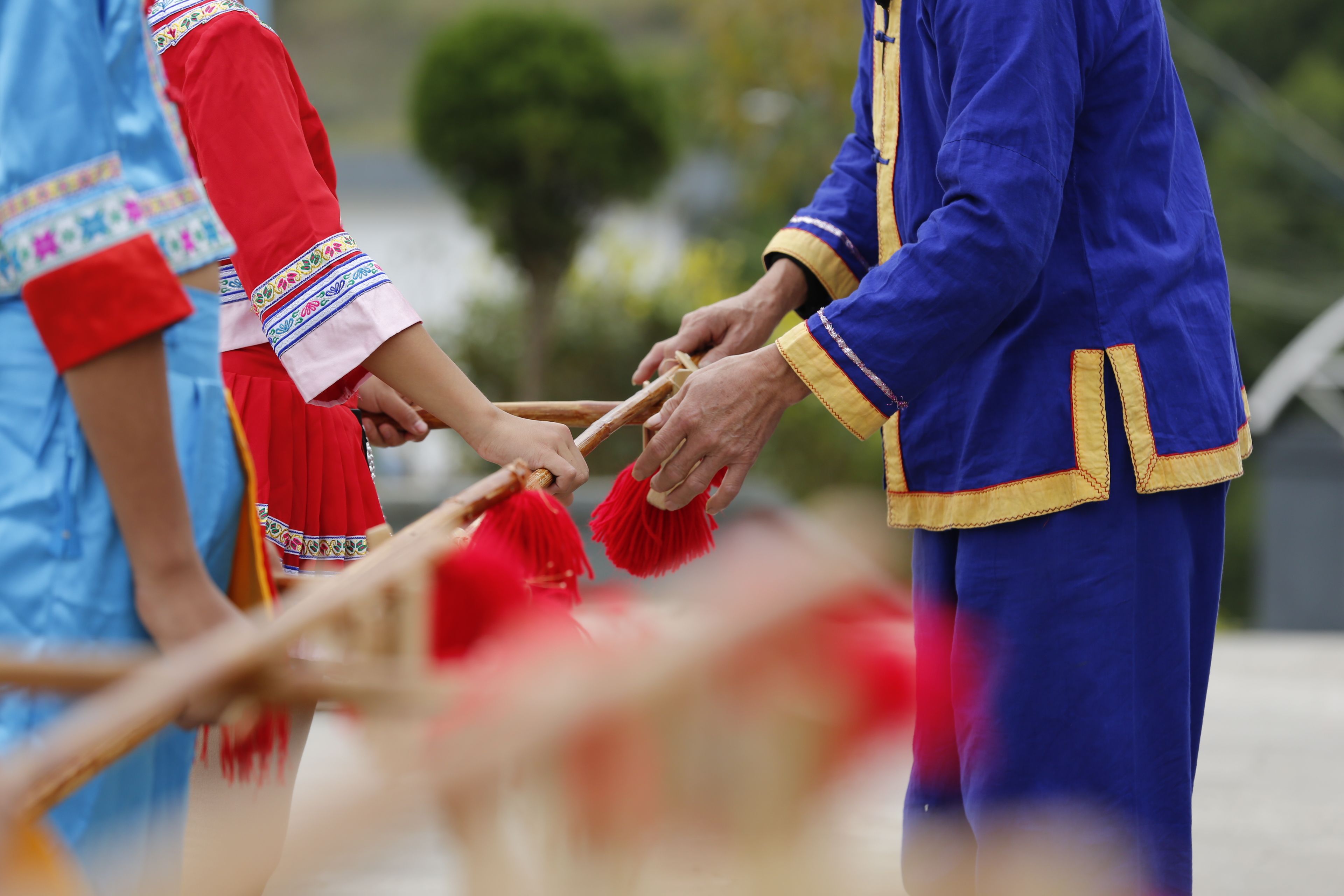圖片名稱:貴州貴陽苗族長竹舞傳承人教孩子們持竿手法