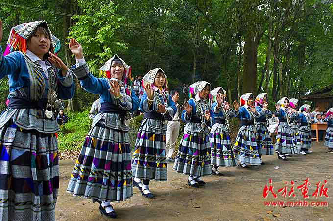 在“寨老”敲響的銅鼓聲里,男人們揮舞著有力的手臂,舞動著彪悍的動作;姑娘們踏著歡快的鼓點,擺手扭腰跳起優(yōu)美的舞蹈;孩子們像林中的小鳥,嘰嘰喳喳地在人群中歡呼雀妖;寨里的老人們坐在場地中央,盡情地享受著包谷美酒和美食。
