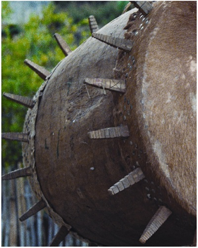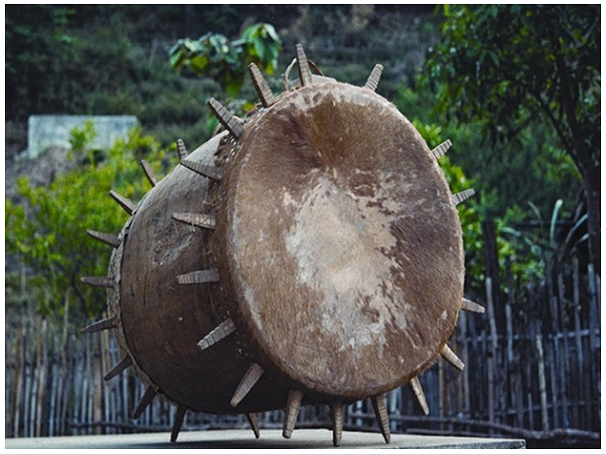 民族文化宮博物館藏基諾族木質(zhì)皮鼓,鼓面直徑55厘米,高88厘米,長約130厘米,20世紀(jì)八十年代征集于云南省西雙版納州景洪縣基諾鄉(xiāng)。鼓身為木質(zhì),呈圓柱形,兩端對稱。鼓有兩面,用牛皮蒙制。兩端鼓面邊緣各環(huán)繞嵌有花紋的上方下錐形的木棍(一側(cè)17根,另一側(cè)為20根),木棍長15厘米。鼓身兩側(cè)有方形孔,為鼓的音孔,上部有兩個把手,用于系繩懸掛木鼓。因鼓面兩端邊沿嵌有數(shù)十根鼓釘,形似太陽放射出的光芒,也稱為“太陽鼓”。