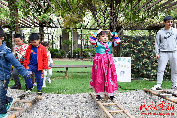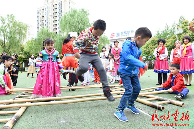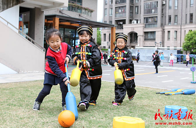 畬族的“摘柿子”、維吾爾族的“賽馬”、黎族的“跳竹竿”、蒙古族的“射箭”……天恒名都幼兒園的操場(chǎng)上,孩子們正積極參加各種民族游戲活動(dòng),沉浸在無憂無慮的快樂中。4月13日,是上海市莘莊工業(yè)園區(qū)天恒名都幼兒園的“民族接力棒小社團(tuán)”活動(dòng)日,孩子們非常期盼這每周一次的活動(dòng)日。