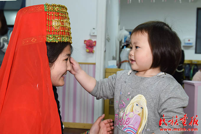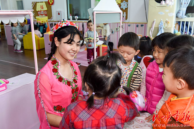 自2014年首場(chǎng)“民族風(fēng)吹進(jìn)幼兒園,愛心曲唱暖身邊人”公益活動(dòng)獲得積極反響后,幼兒園黨支部、工會(huì)、團(tuán)支部牽手園區(qū)民族團(tuán)結(jié)共建單位,走出校園、貼近社區(qū),以愛心義賣、義拍、定向捐助等方式為園區(qū)少數(shù)民族困難家庭送去關(guān)懷。在近幾年的園區(qū)民族工作實(shí)踐中,天恒名都幼兒園的“家、校、社、企”聯(lián)動(dòng)模式不斷發(fā)展創(chuàng)新,培育孵化出少數(shù)民族(幼教)實(shí)習(xí)點(diǎn)、少數(shù)民族志愿者服務(wù)隊(duì)等形式的實(shí)習(xí)模式。2013年至今,幼兒園已為上海市群益職業(yè)技術(shù)學(xué)校的“新疆班”學(xué)生210人次提供了實(shí)習(xí)崗位。