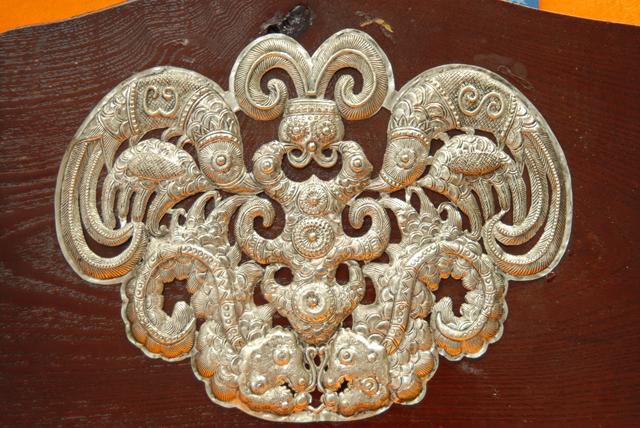 流傳于劍河境內(nèi)的苗族銀飾通常以龍、虎、昆蟲、花鳥等動植物圖案為基本素材,加上鏈狀絞花、鏨花、壓花、編花相互配合,精美中透著靈氣。劍河苗族銀飾根據(jù)造型不同,分為三個片區(qū):革東片區(qū)的項(xiàng)圈為鏈狀絞花式;南寨片區(qū)的項(xiàng)圈為板圈式;久仰片區(qū)為橫板頭式。