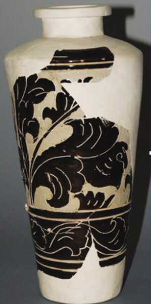 西夏經(jīng)瓶是靈武窯最具特色的西夏器類之一,其器型瘦長,肩部最寬,下腹?jié)u收,平底,假圈足;胎質(zhì)細(xì)膩致密,外壁施釉均不到底,內(nèi)壁施滿釉,釉色以褐釉為主,也有黑釉,白釉少見,白釉瓷均施化妝土;紋飾以牡丹花為主,也有菊花,少見海棠花,輔紋以海水波浪紋和斜線紋為主,花紋細(xì)膩,構(gòu)圖流暢,疏密得當(dāng);整體構(gòu)圖大量使用開光,搭配合理,講究對稱。