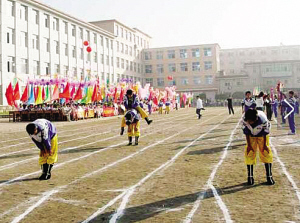 陣擺長(zhǎng)龍跑馬城?!胺直矊⑦x良才,陣擺長(zhǎng)龍對(duì)面排。正欲齊心奪勝券,格格送信出城來(lái)?!边@首詩(shī)描寫的是滿族兒童春季玩的一種游戲——“跑馬城”。玩這種游戲時(shí),孩子們分成人數(shù)相同的兩隊(duì)橫列,面向而站。玩時(shí),甲隊(duì)先誦兒歌一句,乙隊(duì)接下句,一遞一句:“機(jī)機(jī)靈,跑馬場(chǎng),馬城開(kāi),打發(fā)格格送信來(lái)!”“你要誰(shuí)?我要某某某!”被點(diǎn)到名字的兒童立刻向?qū)Ψ經(jīng)_去,對(duì)方陣營(yíng)則手臂相連形成一道防線,沖撞者如果沖破對(duì)方的防線,就從對(duì)方陣營(yíng)中挑選一人帶回自己的隊(duì)伍;如果沒(méi)有沖破對(duì)方的防線,沖撞者就被對(duì)方俘虜了。然后雙方再進(jìn)行下一輪“對(duì)話”和“沖營(yíng)”。游戲結(jié)束時(shí),以剩下人數(shù)多的一方為勝方。這種游戲最適合男孩玩,他們往往玩得滿頭大汗,樂(lè)此不疲!