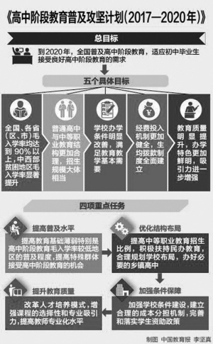 “高中教育是選擇性教育,僅僅提供學(xué)位,缺乏吸引力,學(xué)生不愿意上,普及目標就難以實現(xiàn)。”教育部相關(guān)負責(zé)人解釋說,在確保普及程度的基礎(chǔ)上,要體現(xiàn)全面科學(xué)的普及觀,防止簡單追求數(shù)量和規(guī)模的增加。因此,除了2020年我國高中階段教育毛入學(xué)率將要達到90%這個總目標外,《攻堅計劃》還提出了5個具體目標: