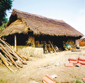 臨滄地區(qū)的耿馬縣芒洪鄉(xiāng)也是布朗族的聚居區(qū)。房屋以草頂居多,也有蓋竹瓦的。三開間居多,門在正中,左邊是火塘,是就餐待客和睡覺的地方,右邊放糧食雜物。房屋為木柱結(jié)構(gòu),縱向框架。大柱立于兩山墻中間,柱腳深埋地下,柱高依屋脊高度而定,柱頂以天然枝杈承托脊檁。以同樣的方法在四角各立頂端帶枝杈的柱子,柱高以屋檐的高度而定,承托邊檁。這樣6根木柱、3根檁木構(gòu)成了主要承重的縱向框架,也形成了雙斜面屋頂。在大柱間密栽小柱,小柱間再橫向綁扎竹片,從地面到柱頂形成密密麻麻的小方格子,這就是墻壁的骨架。然后把和了黃泥漿的長草把一綹綹、均勻地掛到竹片上,將里外抹平,干后就成了“掛”著的草泥墻。