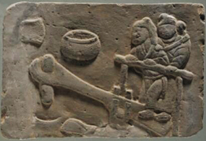 長(zhǎng)31厘米,寬19厘米,厚5厘米,呈長(zhǎng)方形。生動(dòng)刻畫(huà)了一個(gè)推磨的場(chǎng)景。磨的一端為一婦女,一端為一小男孩。婦女頭梳圓形發(fā)髻,身著長(zhǎng)裙、短上衣系長(zhǎng)帶,雙手握推杠于胸前,眼睛注視著推杠另一端身高不及杠的小孩。小孩全身裸露,背朝外,頭向上昂起,看著高過(guò)頭頂許多的推杠,雙手作吃力地推杠狀。整個(gè)畫(huà)面將母子二人推磨時(shí),母親憐愛(ài)孩子的情景淋漓盡致地表現(xiàn)出來(lái)。