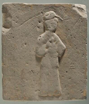 長(zhǎng)30厘米,寬26.5厘米,厚4.5厘米,呈長(zhǎng)方形。畫(huà)面中央刻有一位仕女形象。仕女儀態(tài)端莊,發(fā)髻高高盤(pán)起,衣著長(zhǎng)裙,雙手抱著一個(gè)長(zhǎng)柄執(zhí)壺,輕移蓮步,徐徐向前,像是要給遠(yuǎn)道而來(lái)的朋友斟上一杯家釀的美酒。