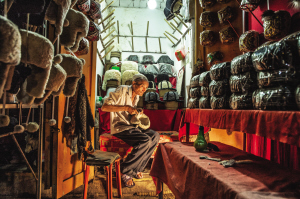 阿布都瓦克·吐?tīng)柡槔先耍衲?3歲,他是阿熱亞路帽子巴扎的手工藝人,店里出售的羊羔皮帽都是他親手制作的。1998年見(jiàn)到他的時(shí)候,他的鋪?zhàn)臃浅:?jiǎn)陋,街巷四周塵土飛揚(yáng)。在巴扎工作近30年,老人見(jiàn)證了喀什古城的發(fā)展變遷。